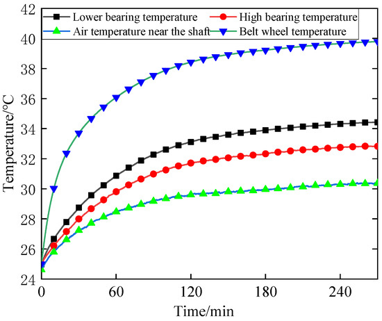 In Figure 8, it was observed that the temperature of the lower bearing (bearing B) was higher than that of the upper bearing (bearing A). This difference can be attributed to the lower bearing (bearing B) being closer to pulley C than the upper bearing (bearing A). The analysis in Section 3—based on heat conduction and convective heat transfer principles—indicates that heat conducted from pulley C increases with shorter distances, leading to less heat dissipation during transfer (due to convective effects). In accordance with the principles of temperature rise and heat dissipation, the greater the heat input, the greater the temperature increase. Conversely, the overall temperature near the shaft was the lowest. This can be attributed to convective heat transfer between the surrounding gas and the shaft (near pulley C). This convective heat transfer exhibits a lower heat transfer coefficient and smaller contact area, leading to significantly less heat transfer than heat conduction. When examining the 0–270 min period, it was observed that the temperature at each sensitive point gradually increased. Initially, the temperature increase was rapid, followed by a more stable temperature profile after 120 min. Notably, the temperature variation was most significant at pulley C. This is because sliding friction at pulley C generates considerably more heat than the rolling friction in bearings A and B.