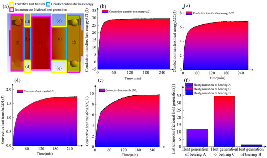 (a) Heat distribution at each part of the spindle structure; (b,c) Heat transfer quantity from pulley C to bearings A and B, respectively; (d,e) Heat transfer quantity between the corresponding shaft segments and the air, respectively; (f) Frictional heat generation quantity of bearings A, B, and pulley C.