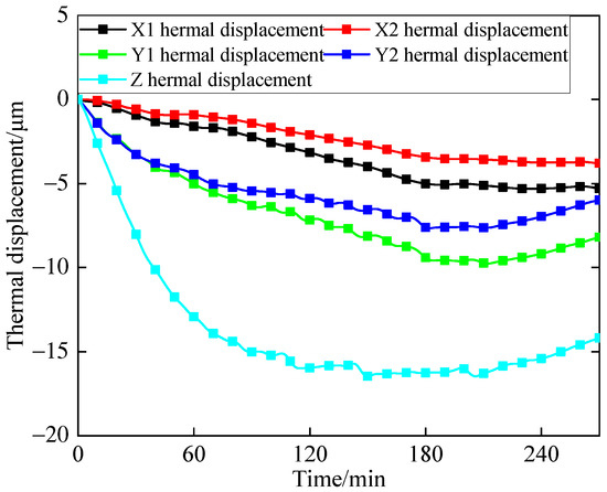 In Figure 10, the maximum thermal displacement was observed in the Z-direction, with a peak value of −16.4674 μm. This phenomenon can be attributed to the spindle’s vertical orientation, where gravitational force caused greater thermal deformation in the Z-direction than in the X and Y directions. The second highest thermal displacement was recorded at the Y1 sensor, with a peak value of −9.7541 μm, whereas the Y2 sensor demonstrated a maximum thermal displacement of −7.6495 μm. Moreover, the X1 sensor exhibited a peak thermal displacement of −5.2992 μm, while the X2 sensor indicated the lowest thermal displacement, at only −3.7903 μm.