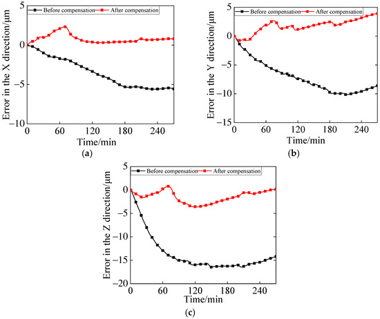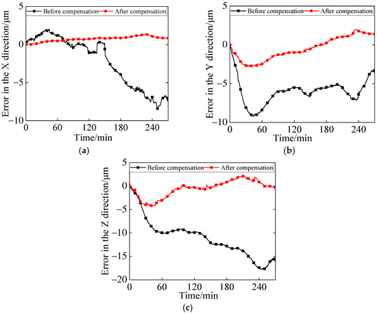 In Figure 13, the X-axis error exhibited the smallest average value after compensation. Prior to compensation, the X-axis error exhibited significant variations but stabilized around 0 μm before the 170th minute. Consequently, the magnitude of the post-compensation error change in the X-direction was noticeably smaller than that in the Y and Z directions. Furthermore, Table 5 and Table 6 present the calculated absolute maximum values, absolute mean values, and error improvement percentages (before and after compensation) for the data in Figure 12 and Figure 13, respectively.