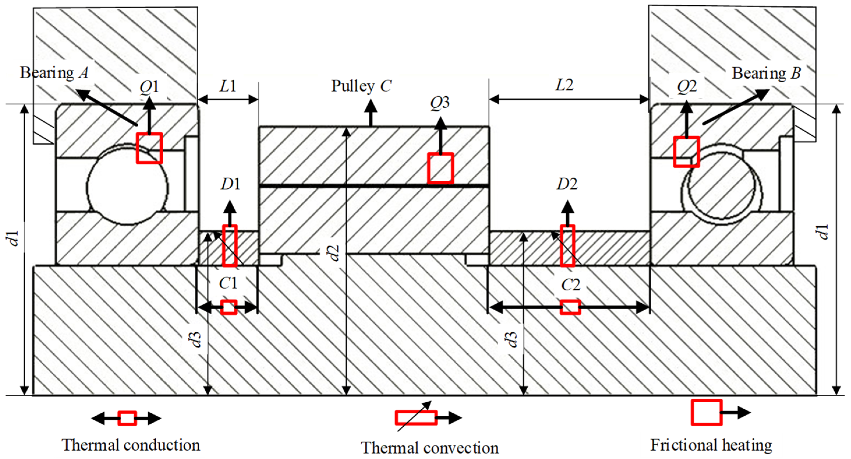 The heat generated by friction between pulley C and bearings A, B causes a temperature rise in these components. The temperature of bearings A, B is further elevated via heat conduction from the marked shaft segments C1 and C2. The air temperature surrounding the spindle also increases due to heat convection (marked as D1 and D2).