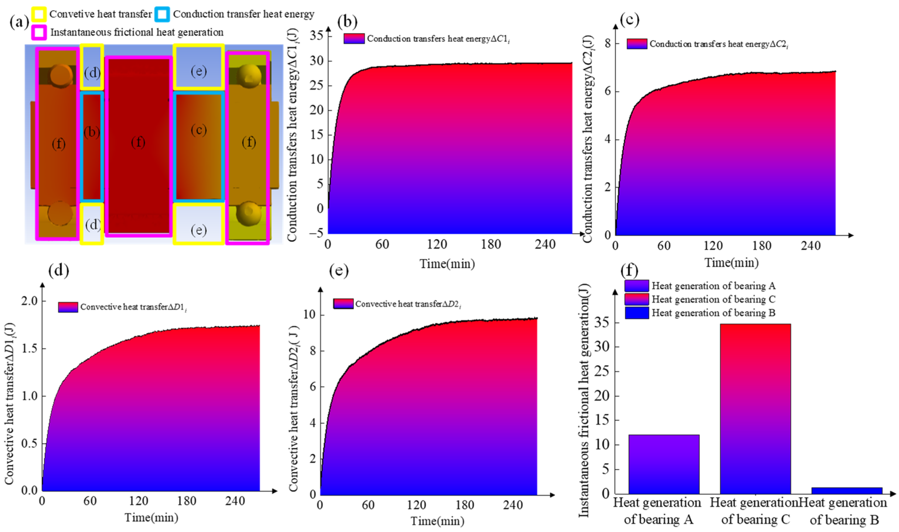 The heat required for the temperature rise of bearings A and B is provided by conductively transferred heat and friction-induced heat. Heat conduction is the primary contributor to this heat requirement. Considering the complexity of the governing equations, the heat input from bearings A and B’s self-friction (for their temperature rise) is disregarded.