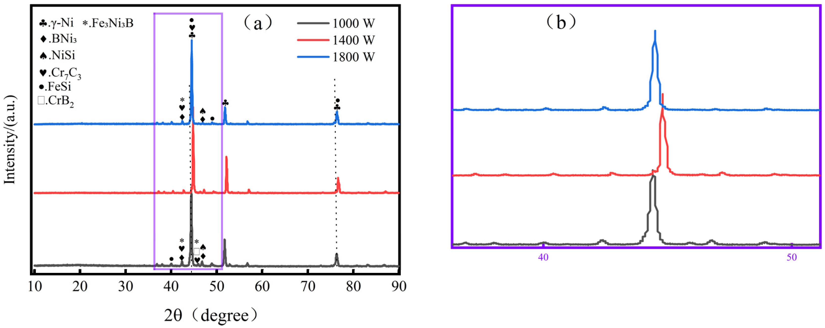 19]. At 1000 W, rapid cooling forms a uniform fine γ-Ni dendritic structure (grain refinement strengthening), while BNi