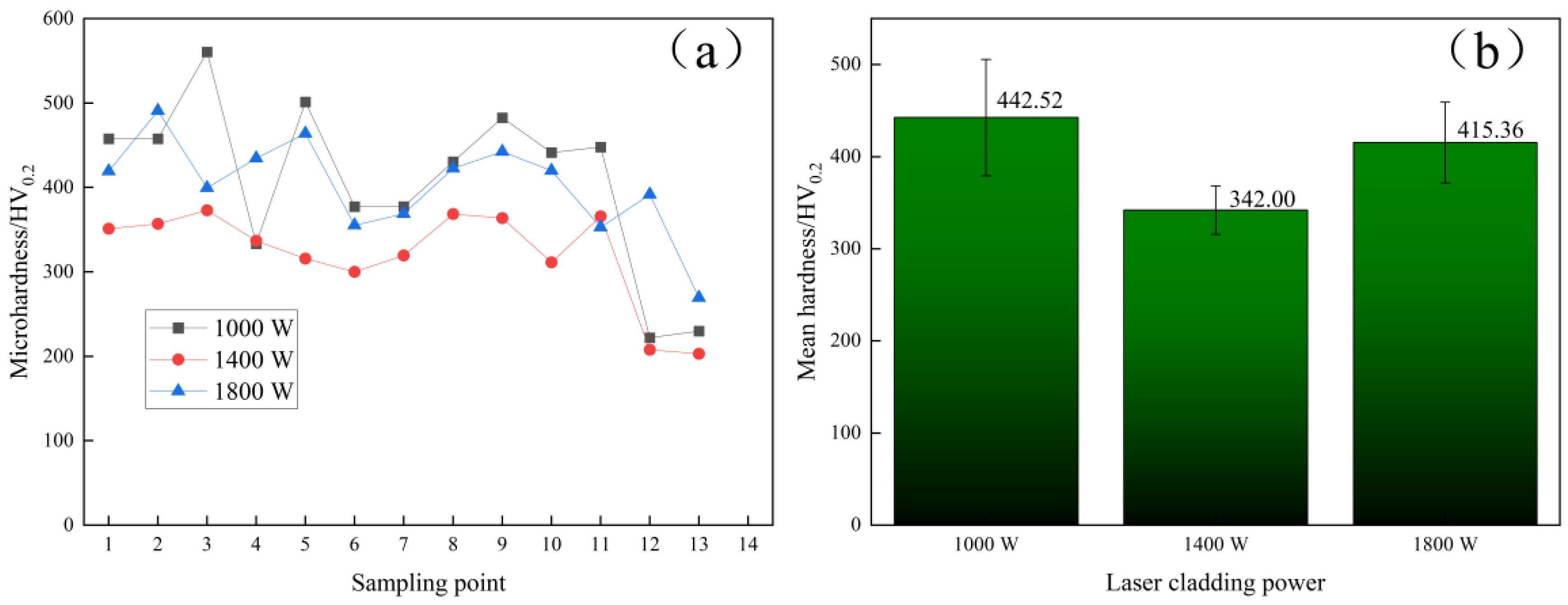 Figure 5a correlates strongly with the aforementioned phase composition (XRD analysis) and microstructural evolution patterns (SEM observation), collectively revealing the strengthening and softening mechanisms of laser-clad Ni25: At 1000 W power, the cladding layer exhibits the highest average hardness (442.52 HV as shown in