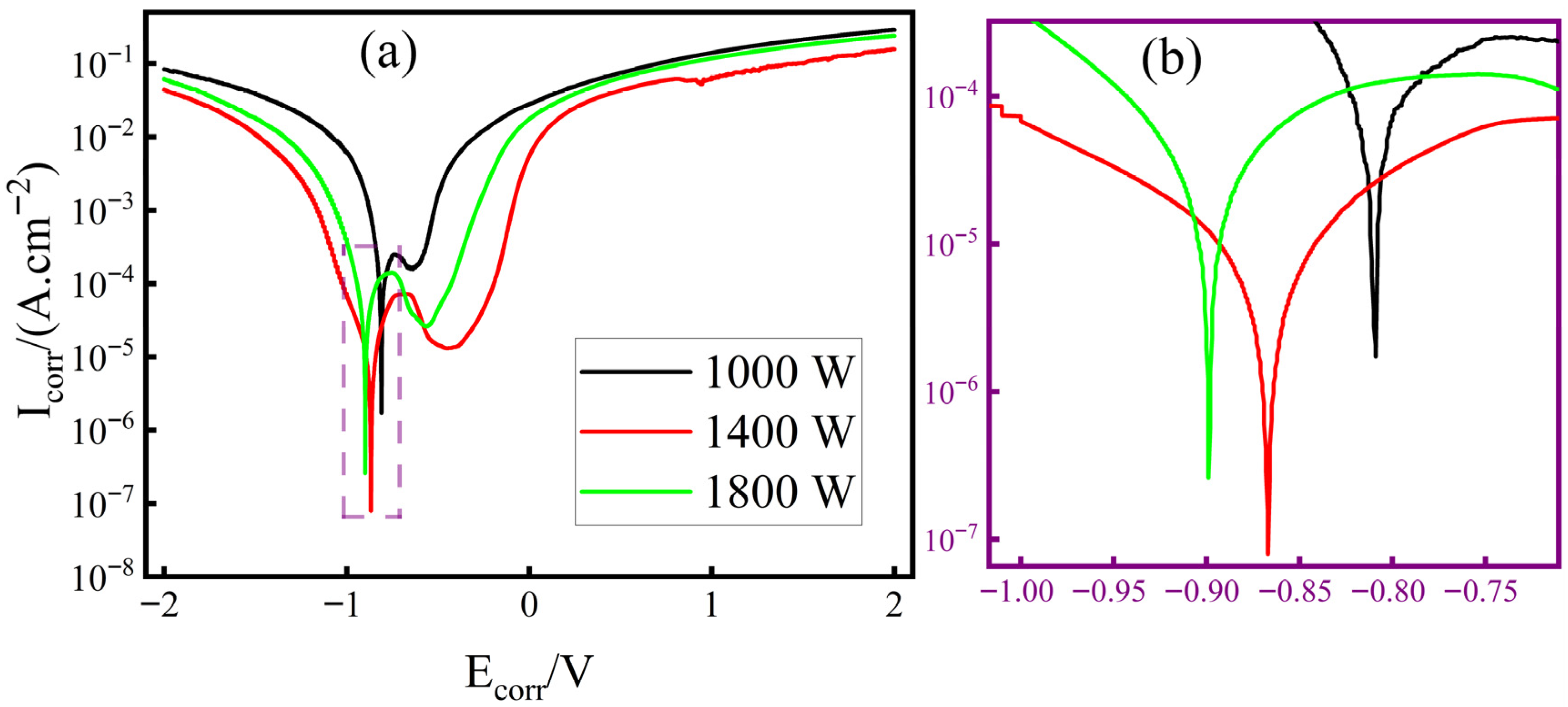 31]. The electrochemical test results for the Ni25 cladding layer at three power levels (1000 W, 1400 W, 1800 W) are shown in
