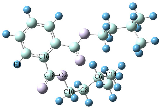 Obtaining accurate molecular structure and energy information is a prerequisite for establishing subsequent models in the study of the relationship between lubricant molecular structure and performance. This article uses Gaussian 16 software [19] to first optimize the structure and analyze the vibration frequency of Diisopentyl phthalate (DIPP) molecules using two different methods, B3LYP [20,21] and M062x [22], under three different basis sets: def2svp, 6-31G (d, p), and def2-TZVP. By systematically analyzing and comparing the computational performance of different methods and base groups, determine the optimal computational solution. The B3LYP method, as a widely used hybrid functional, combines Hartree–Fock exchange energy (20%), Becke three-parameter exchange function (B3), and nonlocal correlation function (LYP), demonstrating good applicability in balancing geometric configurations and vibration frequency calculations. Its ability to describe weak interactions and hydrogen bonds is weak, but it is sufficient to meet the simulation needs of the main chain structure of ester compounds in this study. The M062x method belongs to the second generation of hybrid functionals, which enhances the descriptive ability of electron correlation by improving the exchange correlation functionals, and is particularly suitable for accurate calculations of systems containing π bonds. However, this method requires high computational resources and may lead to superlinear scaling behavior. The selection of the three basic groups follows the principle of “minimum necessity”. Def2svp is the minimum splitting valence bond group with high computational efficiency, but it only includes the polarization function (p-orbital), resulting in significant errors in describing bond length and angle. 6-31G (d, p) is a medium-sized basis set that includes the d-orbital polarization function and p-orbital dispersion function, exhibiting balance in equilibrium geometry optimization. Def2-TZVP is a Gaussian orbital basis set, consisting of double zeta series and polarization function (d orbital), with the highest computational accuracy but significantly increased time consumption. Table 2 summarizes the calculation results of key parameters of DIPP molecules. The predicted error of bond length/bond angle calculated by B3LYP/6-31G (d, p) is less than 0.5%, which meets the requirements of molecular dynamics simulation input, and the calculation time for a single configuration is short, supporting batch processing. Based on comprehensive accuracy (consistency with literature values), computational cost (CPU time), and model construction requirements, B3LYP/6-31G (d, p) was ultimately selected. The optimized molecular structure of DIPP with B3LYP/6-31G (d, p) is illustrated in Figure 2.