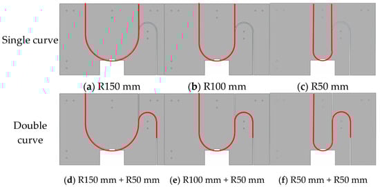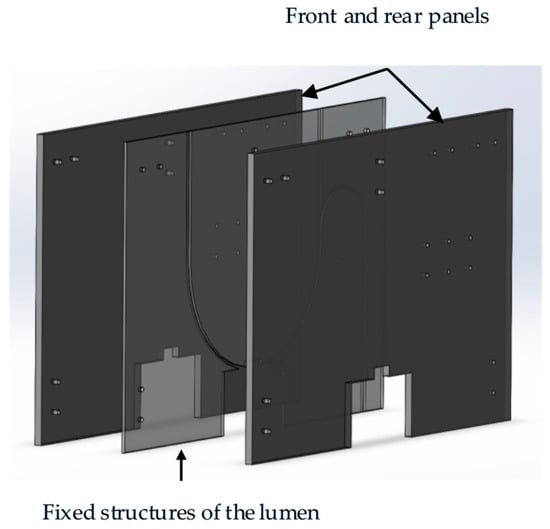 Lumen fixation section: The lumen fixation section is a custom-made structure designed to secure the vascular model in place. This ensures the accuracy and reliability of the experiment. The fixed structure includes the front and rear panels and a replaceable lumen fixed plate in the middle, as shown in Figure 4. The single-curve structure’s semi-circular bend has radii of 50 mm, 100 mm, and 150 mm. The double-curve structure features a semi-circular bend with a 50 mm radius, complementing the single-curve design (Figure 5).