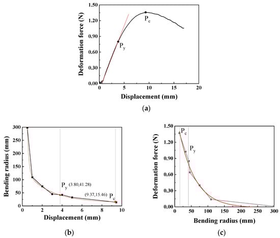 The relationship between the deformation force, displacement, and bending radius of the catheter (the moving speed is 0.1 mm/s): (a) Displacement–deformation force curve (Py: yield point, Pc: critical point), (b) Displacement–bending radius curve, (c) Bending radius–deformation force curve.