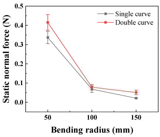 In the static state, the normal force applied by the catheter to the bottom of the lumen is shown in Figure 8. The smaller the curve radius, the greater the normal force applied by the catheter to the lumen, which is consistent with the results of the three-point bending experiment; that is, the smaller the lumen radius, the greater the normal force applied by the catheter to the lumen. When the degree of lumen curvature is greatest, specifically the double-bend lumen with a radius of 50 mm, the maximum normal force that the catheter can apply to the lumen is 0.42 N. When the catheter moves cyclically within the lumen at a given speed, it exerts a periodically changing normal force on the lumen, as shown in Figure 9. The amplitude of the normal force variation increases with a decrease in the radius of the lumen. The change in the number of curves in the lumen will also affect the normal force exerted by the catheter on the lumen, and this change in normal force is reflected in the push–pull force of the catheter. The cyclic variation in normal force during catheter motion indicates a hysteresis loop in the loading–unloading of the catheter–lumen system. This hysteresis represents energy dissipation, which is a direct contributor to the measured friction (push–pull force). Figure 10 shows the relationship curve between the average push–pull force of the catheter and the different curve radius. It can be observed that the average push–pull force decreases with an increase in the curve radius, while the number of bends increases significantly, resulting in a higher average push–pull force for the catheter.