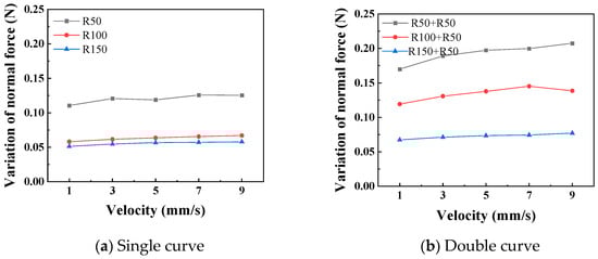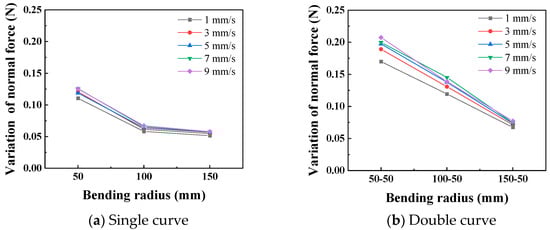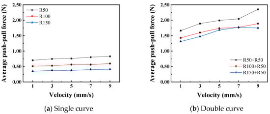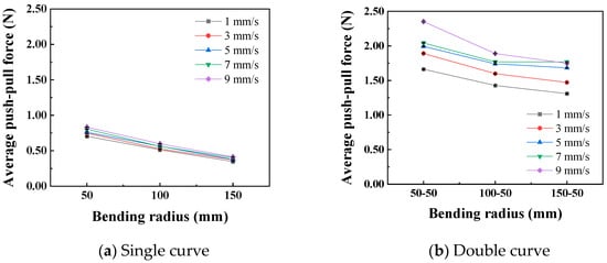 Figure 11 shows the relationship curves between different push–pull speeds and the amplitude of the normal force variation. It is observed that the smaller the curve radius, the greater the influence of the push–pull speed on the normal force on the curve. Additionally, the normal force on a double curve is greater than that on a single curve, and this difference is magnified in the changes in the push–pull force of the catheter. Figure 12 shows the relationship curves between different push–pull speeds of the catheter and the changes in the average push–pull force. It can be observed that the average push–pull force increases with the increase in speed, and the increase in the number of curves significantly amplifies this difference.