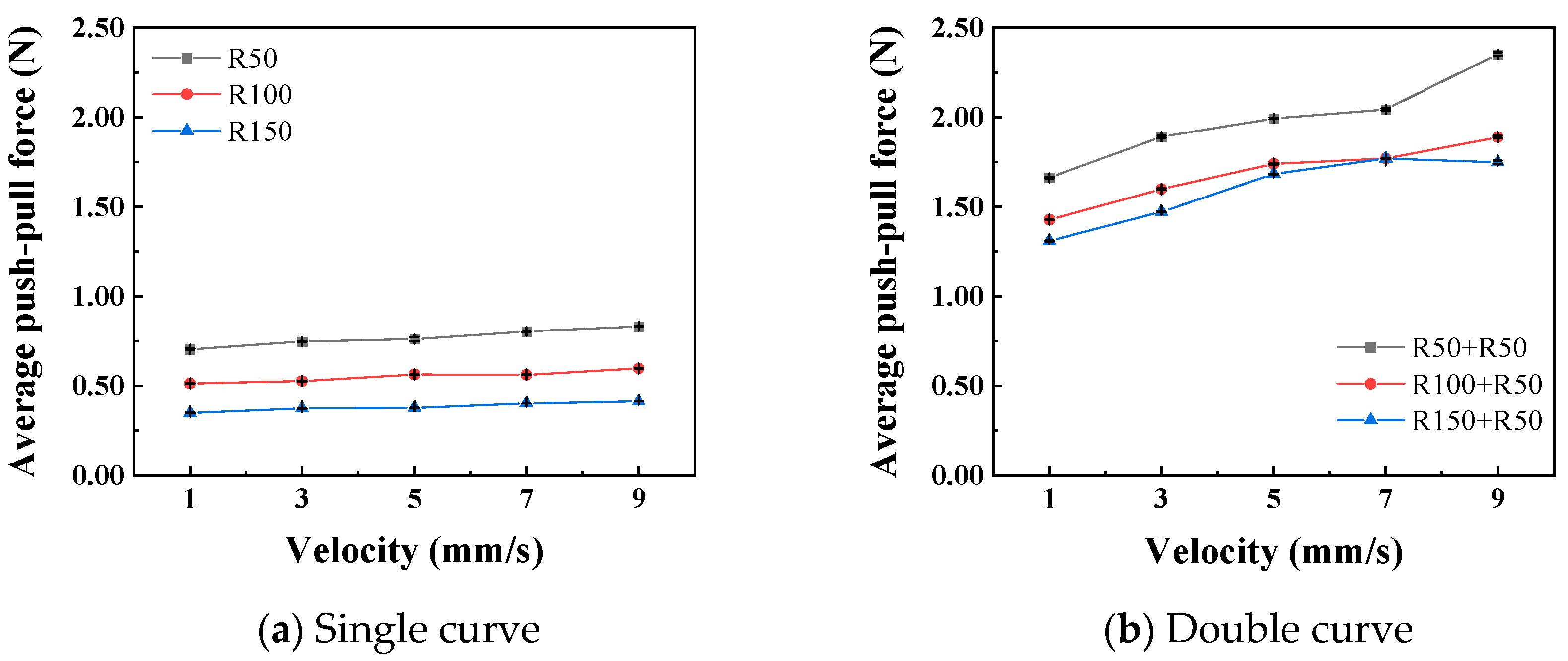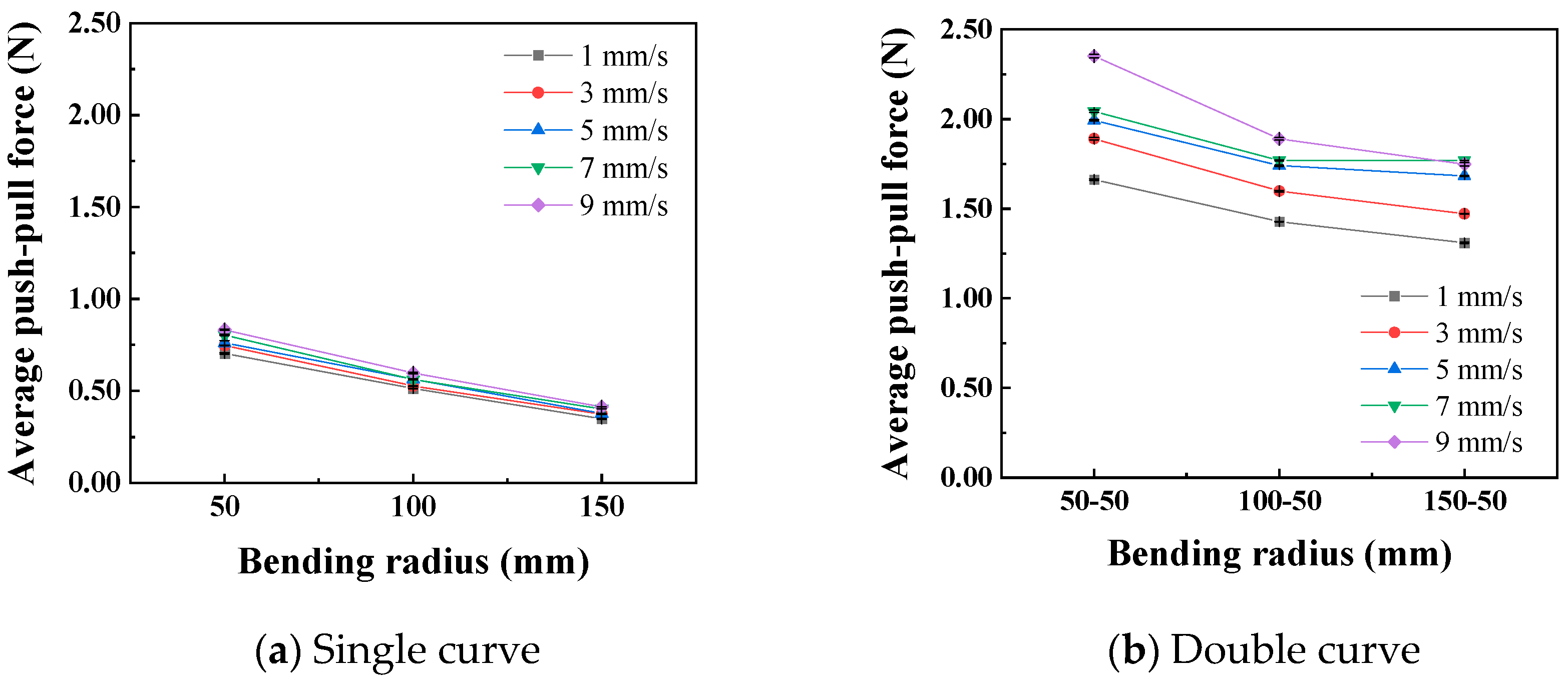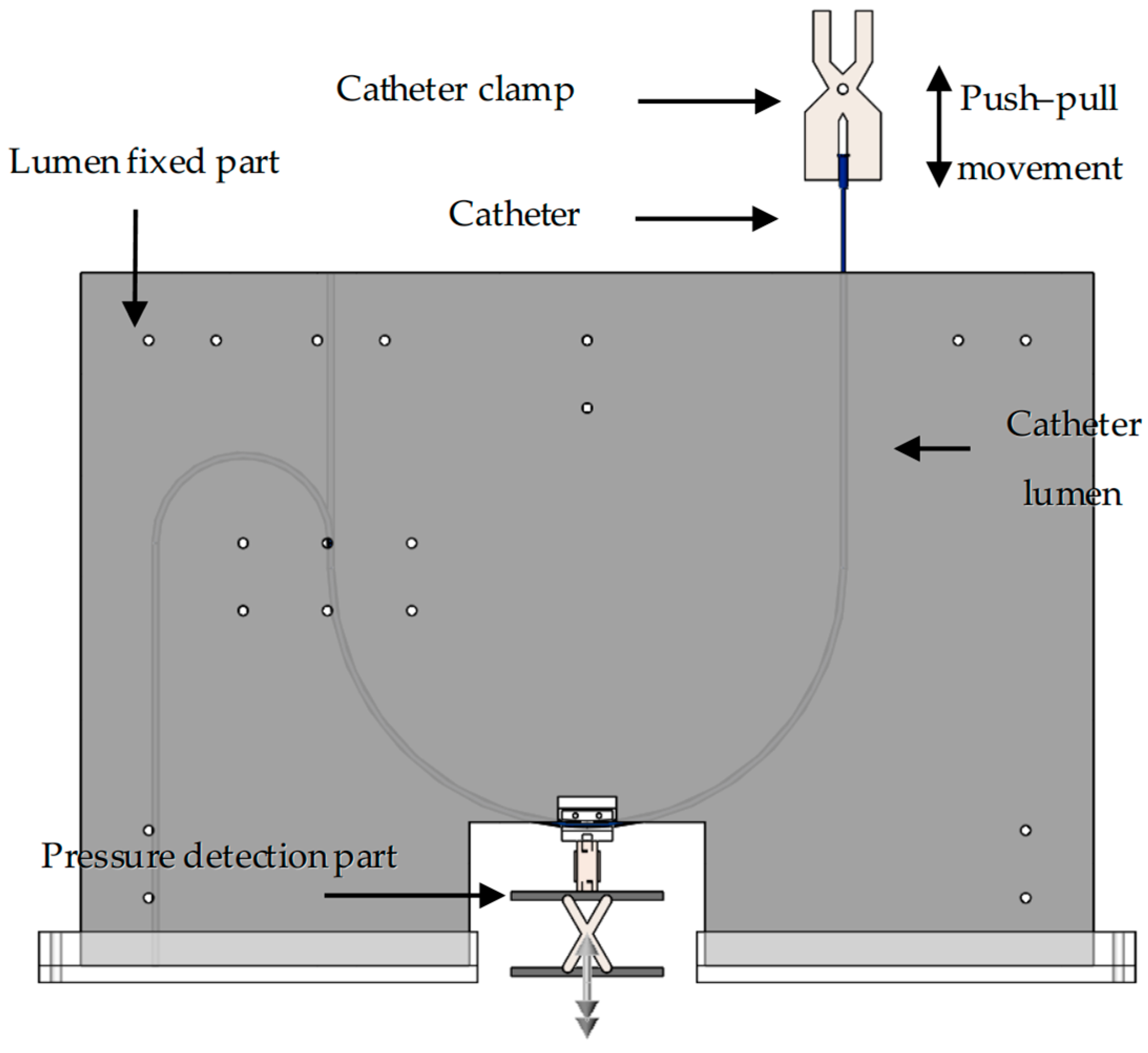- When the catheter performed push–pull movements in the lumen, the degree of lumen curvature had a more significant impact on the push–pull force at the catheter tip and the push–pull force on the lumen compared to the push–pull speed. Therefore, in vascular interventional procedures, it is necessary to comprehensively consider the limitations of vascular curvature and the control of push–pull speed to select appropriate interventional devices for the operation.