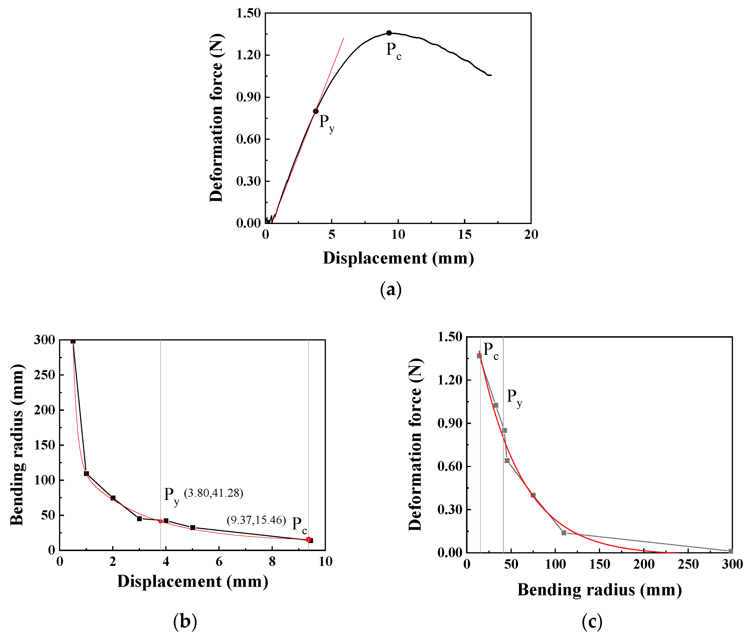 - In the three-point bending test, the bending deformation force of the catheter increased as the radius decreased. It first reached the yield point at a bending radius of 41.28 mm, with a bending deformation force of 0.8 N; it reached the critical point at a bending radius of 15.46 mm, with a maximum bending deformation force of 1.36 N.