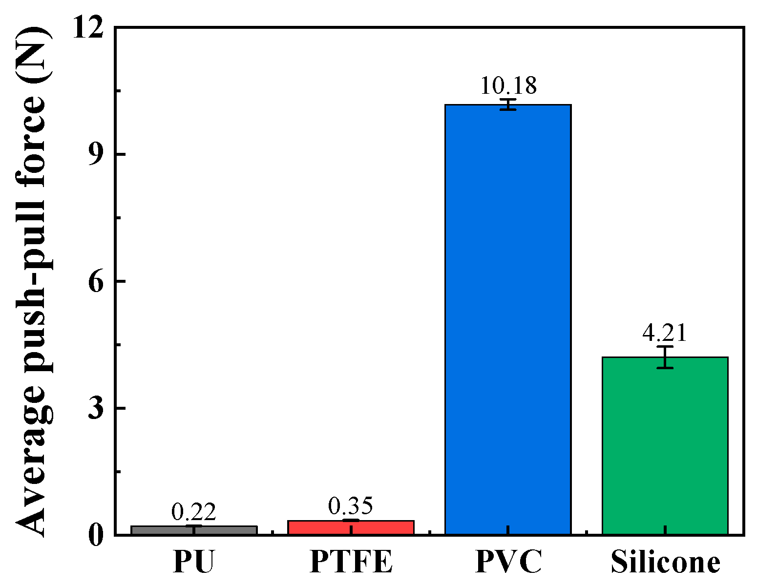 - PVC and silicone materials are not suitable for simulating the vascular lumen due to their excessive push–pull resistance. TPU and PTFE materials have relatively small and similar push–pull resistance.