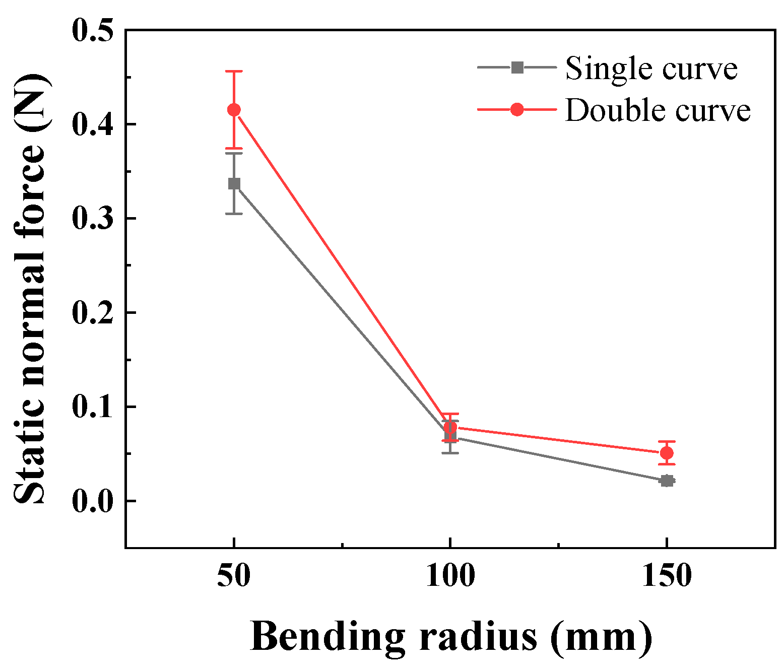 - The normal force exerted by the catheter on the lumen in a static state increased as the curve radius decreased and increased with the increase in the number of curves. The curve radius and the curve number of the catheter lumen can be regarded as the degree of lumen curvature. The smaller the curve radius and the greater the curve number, the higher the degree of lumen curvature.