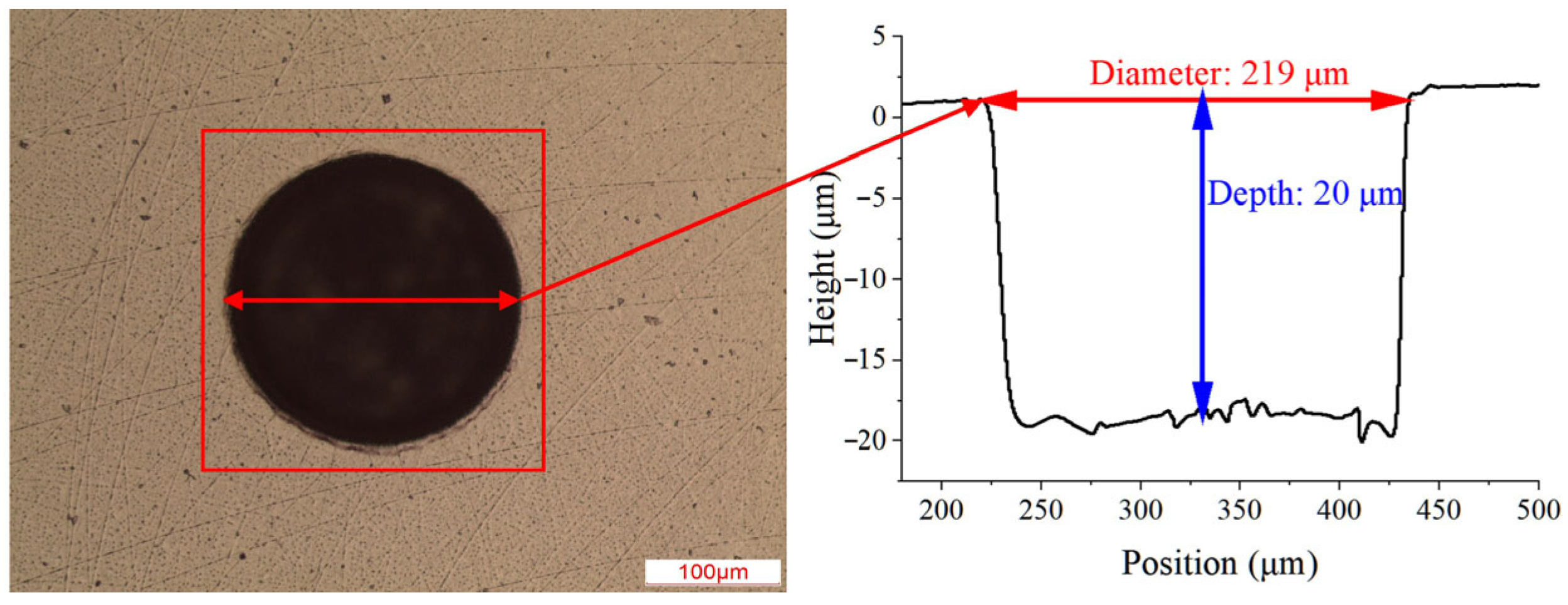 To better elucidate the relationship between texture density and abrasive particle concentration, this paper focuses on a single surface texture parameter. It has been demonstrated that a texture with a depth-to-diameter ratio of 0.1 [37] and a depth of 20 μm [38] exhibits optimal friction performance. Referring to the conclusion of the above paper, this paper used laser surface texturing to create circular textures on the surface of the GCr15 disk, featuring a depth of 20 μm and a constant texture diameter of 0.219 mm, which takes into account the size of the abrasive particles. The optical profile and specific parameters of the texture are presented in Figure 2.