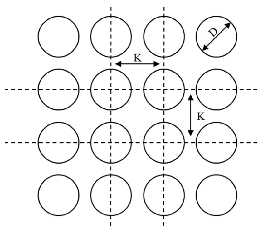 where T d is the texture density; A d is the area of the texture ( A d = π D 2 4 ); A t is the area of the texture unit ( A t = K 2 ); D is the diameter of the texture; and K is the variable length of the texture unit as shown in Figure 3. Similar descriptions of textures can be found in the literature [38].