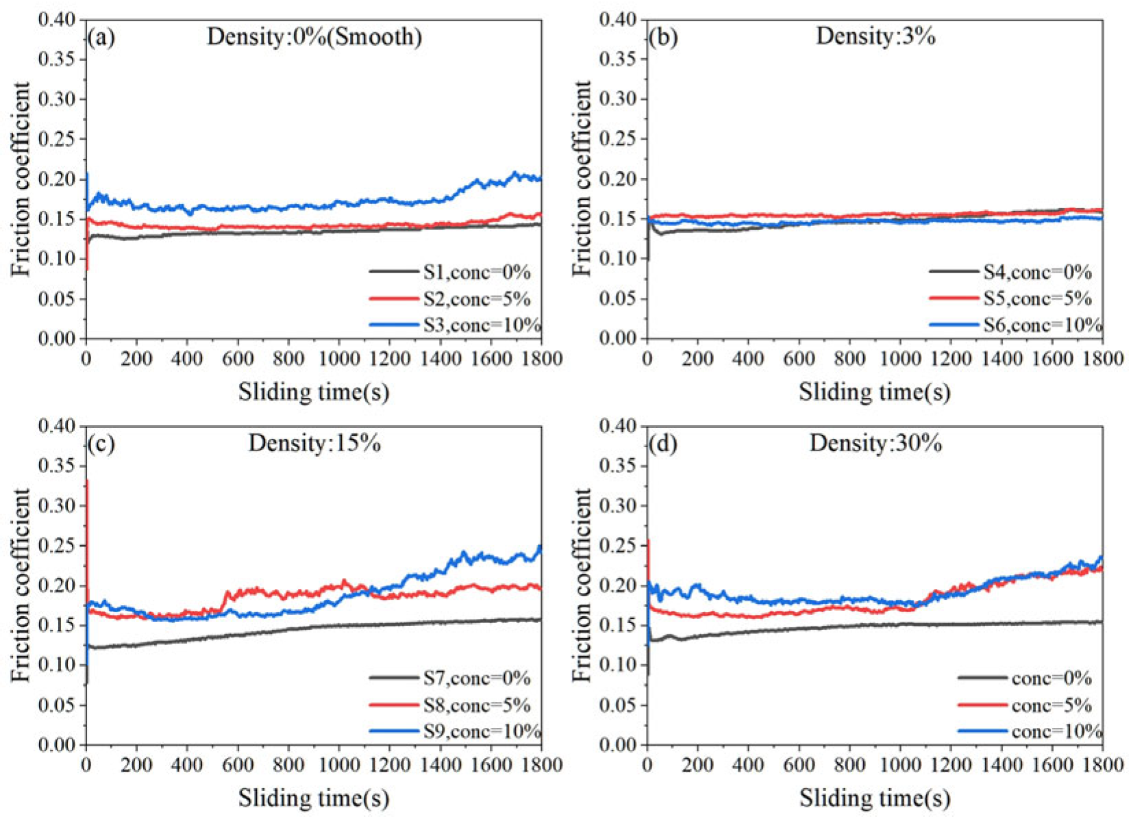 Figure 5. Friction coefficient curves for the same density textured surface at different concentrations. (a) Density of 0%; (b) density of 3%; (c) density of 15%; (d) density of 30%.