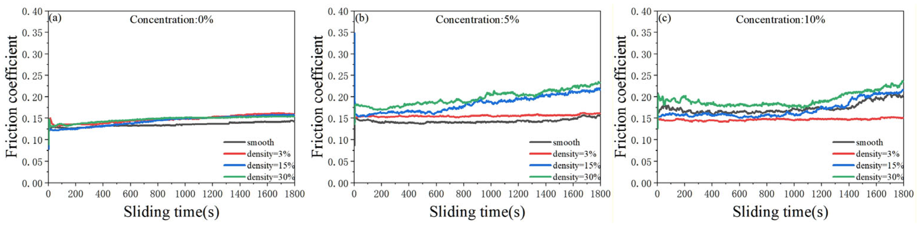 Figure 6. Friction coefficient curves for the same particle concentrations at different densities. (a) Concentration of 0%; (b) concentration of 5%; (c) concentration of 10%.