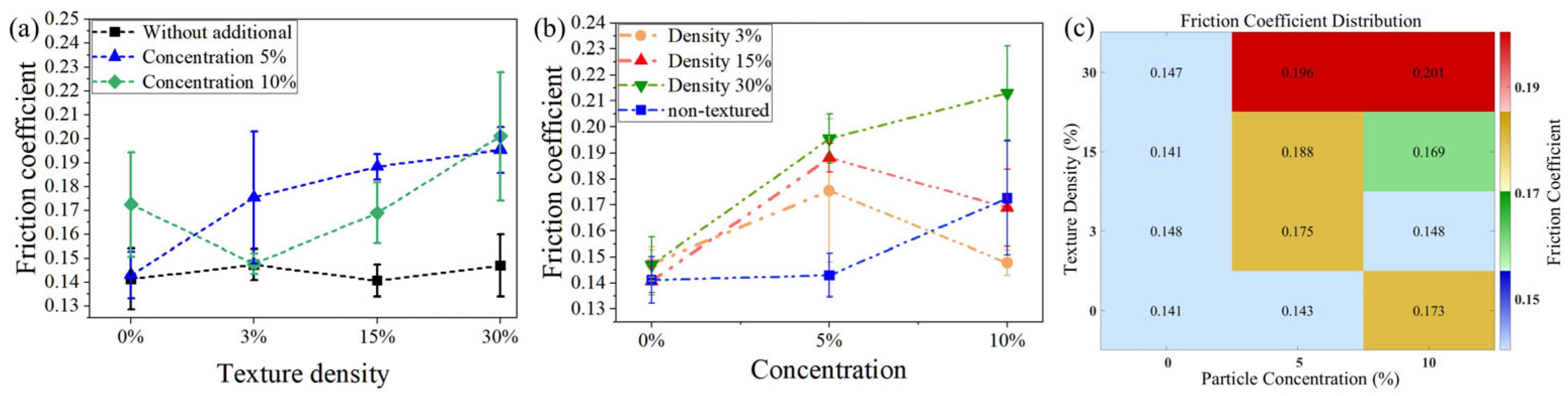 Figure 7. Performance of friction coefficients for different texture densities and abrasive particle concentrations. (a) Friction coefficients for different texture densities; (b) friction coefficients for different abrasive concentrations; (c) heat map of friction coefficient distribution under different combinations of texture density and particle concentration.