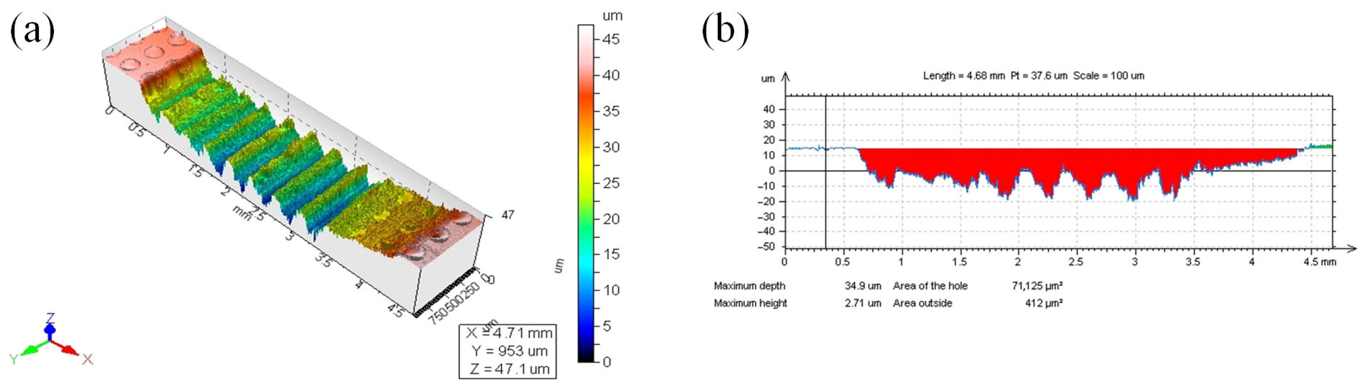 ΔV is the volume lost (mm3), F is the contact force (N), v is the reciprocating speed (m/s), and t is the experimental time (s). The cross-sectional area of the abrasion mark S (mm2) was calculated from the two-dimensional profile (Figure 9b, area of the hole in red) using CLSM analysis software (Leica Map, version 6.2) with the unworn surface as reference. The scratch length h is the 10 mm reciprocating distance. A summary table of the calculated wear rates is shown in Table 5 below.