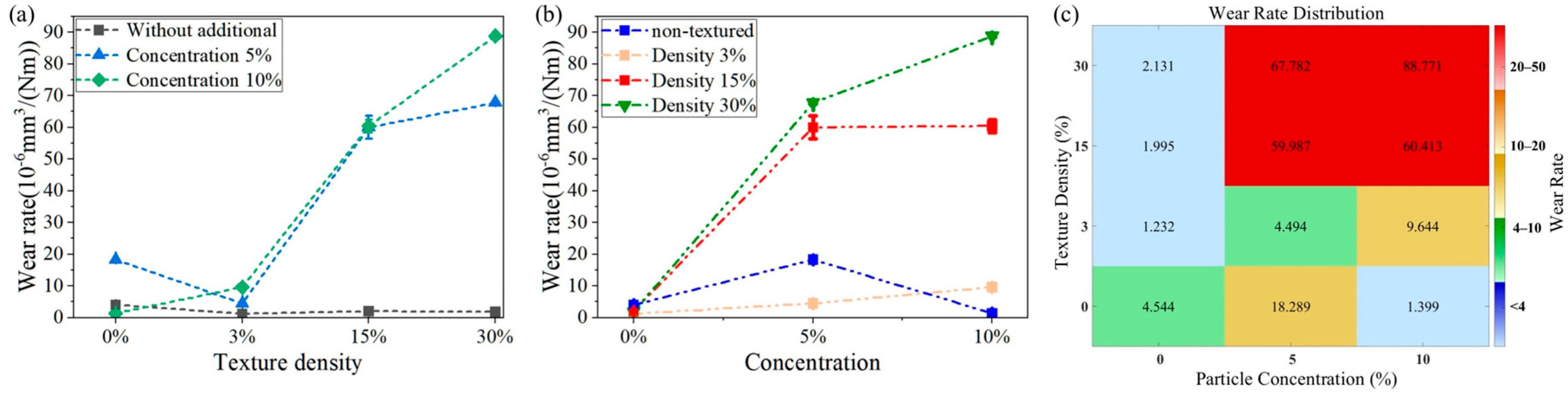 Consistent with the friction coefficient heat map (Figure 7c), the wear rate heat map in Figure 10c demonstrates that the wear rate is also simultaneously dictated by both texture density and particle concentration, rather than by either variable in isolation. The effect of texture density on the wear rate is not significant in the absence of applied abrasive particles. As shown in Figure 10a, even though the texture area ratio increases, the wear rate exhibited a slight tendency to decrease and then increase. However, the overall change is minimal, indicating that the influence of texture density on the wear rate is limited under lubrication conditions with minimal abrasive particles. The effect of texture density becomes significant when abrasive particles are applied. As shown in Figure 10a, the wear rate increased significantly with an increasing texture–area ratio, at 5% and 10% abrasive particle concentrations. Notably, the increase is more pronounced at the higher particle concentration of 10%. This observation suggests that higher texture density adversely affects friction performance under high-particle-concentration conditions. Further analysis indicates an interaction between texture density and particle concentration, as shown in Figure 10b: at low texture densities (3%), the influence of abrasive concentration on wear rate is not significant; in contrast, at higher texture densities (15% or 30%), the wear rate exhibited a marked increase correlating with the rise in particle concentration.
