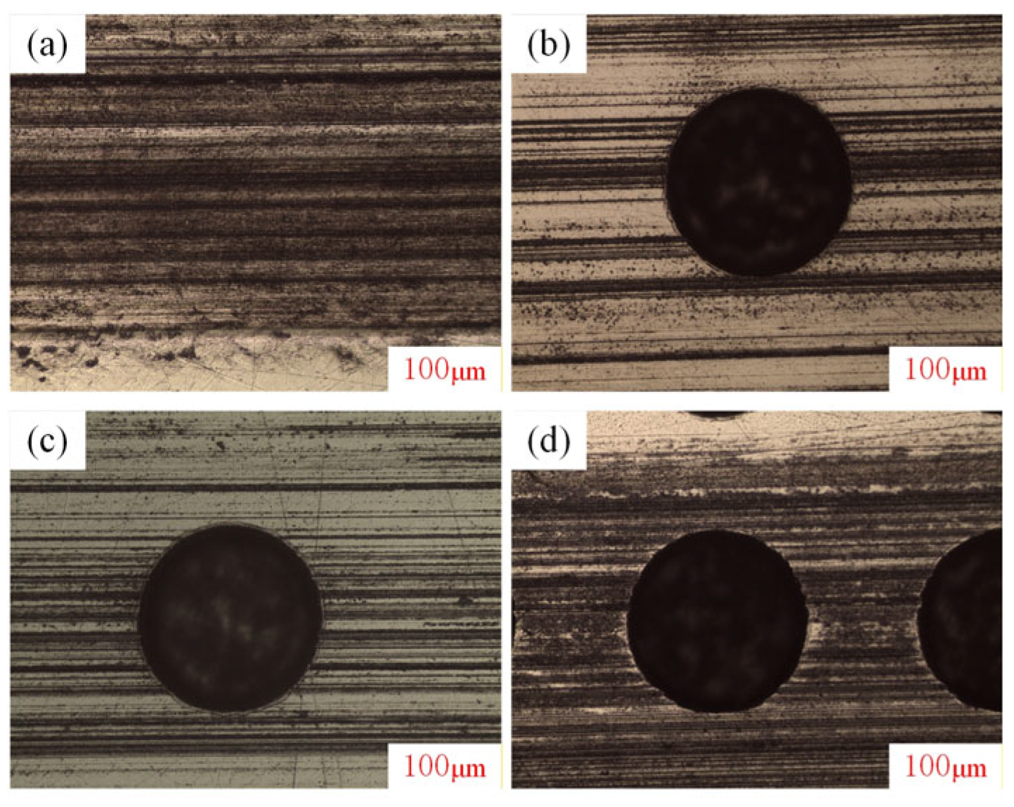 Figure 11. Wear behavior of different surfaces at 0% abrasive concentration. (a) Non-texture (density of 0%); (b) density of 3%; (c) density of 15%; (d) density of 30%.