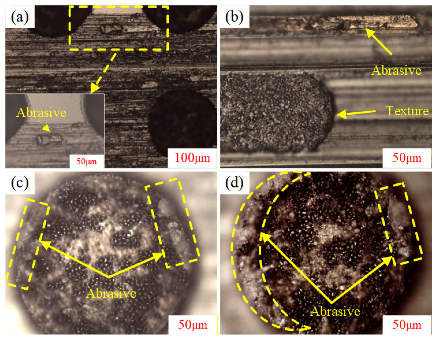 Figure 12. Abrasive particles on abrasion marks. (a) Density of 30% and concentration of 5%; (b) density of 30% and concentration of 10%; (c) density of 3% and concentration of 5%; (d) density of 3% and concentration of 10%.