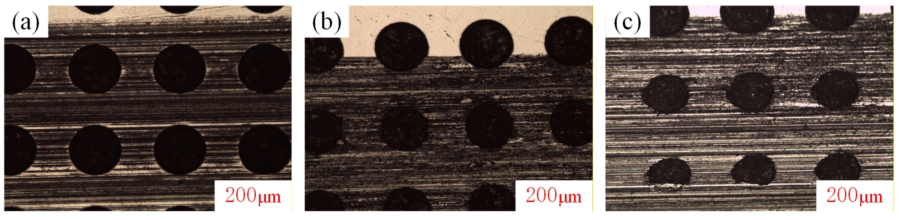 In summary, the effects of texture density and particle concentration on the wear resistance of GCr15 textured samples were investigated. The influences of abrasive particles on the texture were examined under conditions of low speed, heavy load, and boundary lubrication.