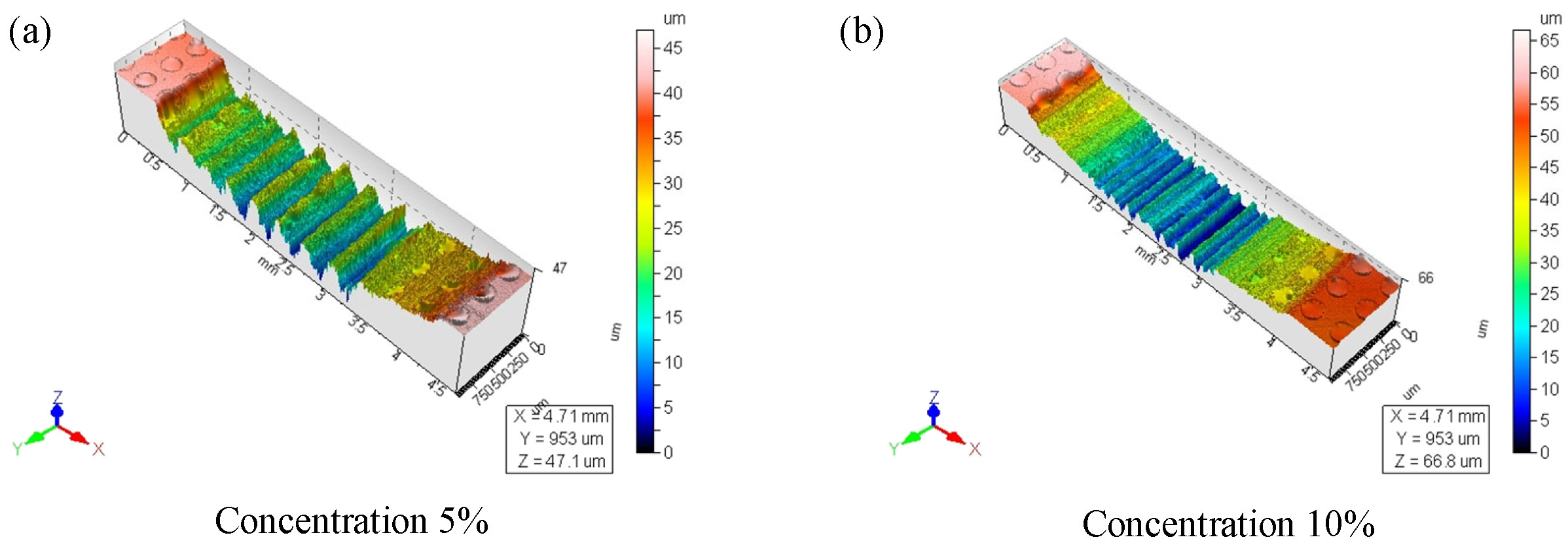 Figure 14. Three-dimensional wear map of the textured surfaces at a density of 30%. (a) With particle concentration of 5%; (b) with particle concentration of 10%.