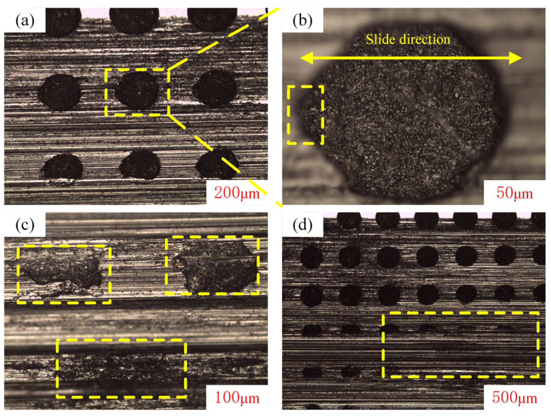 Figure 15. Destroyed surface texture along the sliding direction for a sample with 30% texture density and 10% abrasive concentration. (a) microscopic image of the wear mark edge; (b) initial wear damage located in the sliding direction; (c) different degrees of wear and tear; (d) almost complete disappearance of the texture features.