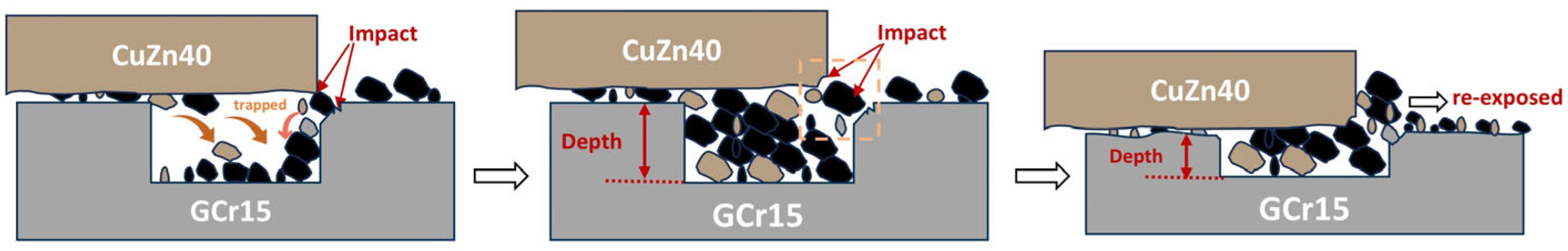 The progression of wear involves two concurrent material introduction pathways. The schematic diagram of the texture wear degradation mechanism is shown in Figure 16. On one hand, the wear of the counterpart (e.g., the brass pin, Figure 12a,b) generates debris that enters the interface as new abrasive particles, which mix with the initially added Al2O3 particles to form a hybrid third body. On the other hand, the gradual wear of the textured structure itself leads to a continuous reduction in its depth. This causes the abrasive particles originally trapped within the textures to be re-exposed to the contact surface, thereby continuously supplying abrasives for subsequent impact wear. This self-accelerating wear mechanism persists until the textured features are completely worn away (Figure 15).