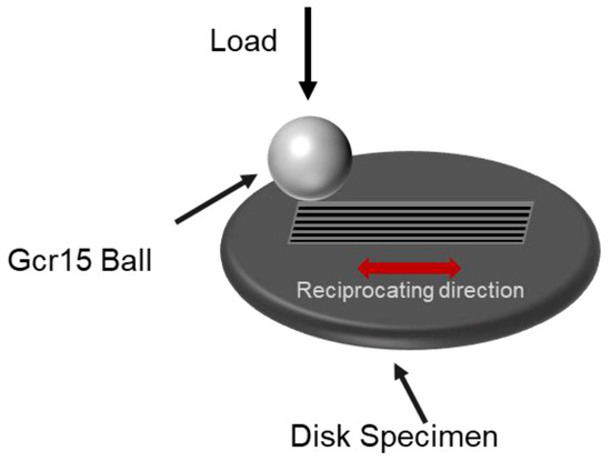 The tribological characterization was carried out using a Rtec rotary friction testing machine (MFT-5000, Rtec, San Jose, CA, USA). Based on the ball-on-disk model (Figure 2), reciprocating experiments were conducted at room temperature. Low-carbon bearing steel balls (Gcr15, diameter = 10 mm) were used under dry friction conditions, with a sliding frequency of 5 Hz for 20 min. A white light interferometer (Contour GT-X, Bruker, Karlsruhe, Germany) was chosen to analyze the wear amount of the wear trajectory after friction testing. Before the trial, all samples were polished with waterproof grinding paper to obtain Ra ≤ 0.1 μm.