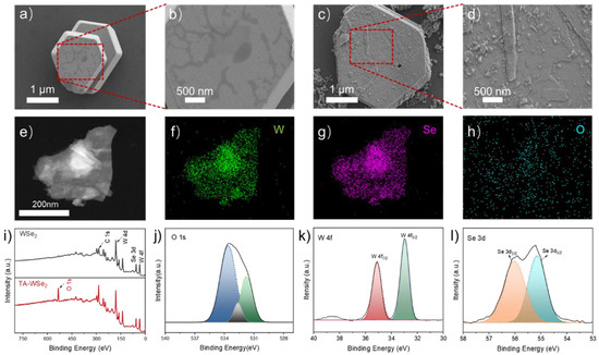 SEM images of (a,b) WSe2; (c,d) TA-WSe2; (e) TEM images of (e) TA-WSe2; (f–h) EDX mapping images of TA-WSe2. (i) Wide scan survey XPS spectra of WSe2 and TA-WSe2; (j–l) O 1s, W 4f, and Se 3d of TA-WSe2.