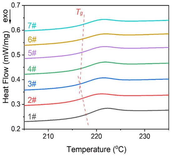 The effect of the inclusion of the hybrid on the thermal behavior of nanocomposites was detected by DSC, as shown in Figure 5. By comparing the glass transition temperature, it can be seen that the Tg of nanocomposites gradually transitions towards higher temperature. The thermal conductivity of WSe2 is much higher than that of PEI. Thus, the introduction of PTFE and TA–WSe2 hybrid can bear partial heat dissipation to improve the thermal stability of composite materials, which helps to prevent molecular chain movement in nanocomposites during friction and maintain the stability of the matrix [38].