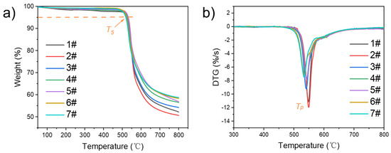 Figure 6a,b show the TGA and DTG curves of PEI composites with different nanofiller contents. From the graph, it can be seen that, compared to the temperature at 5% decomposition, the composite material with 5% addition increased from 527.8 °C to 530.3 °C compared to pure PEI. In addition, with the increase in PTFE and TA–WSe2 hybrid material content, the carbon residue at 700 °C shows a trend of first increasing and then stabilizing. This is because PTFE and TA-WSe2 mixtures are very stable throughout the entire temperature range and can serve as insulation layers for composite materials to delay polymer thermal decomposition [39]. When the addition amount exceeds 7%, the thermal insulation effect of the nanofiller reaches saturation under high temperature.