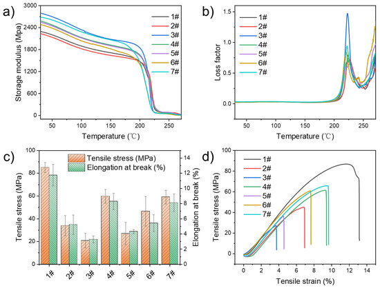 Dynamic mechanical analysis (DMA) testing was conducted on PEIPEI/PTFE-WSe2 composite materials in the temperature range of 25–300 °C. During the dynamic stress oscillation process at a frequency of 1 Hz, the storage modulus (E′) and loss factor (tanδ) were measured, and results are shown in Figure 7. From Figure 7a, it can be seen that as the temperature increased, while the storage modulus of all samples shows a decreasing trend. Comparing samples 1# and 2#, it was found that there was a slight decreased after the addition of 10% PTFE. Obviously, -F and vinyl groups forming PTFE molecular branches could move more flexibly at high temperatures, unlike PEI with the benzene ring. Therefore, the molecular structure became slightly softer, resulting in a decrease in storage modulus. Then, after adding the rigid nanofiller WSe2, the storage modulus of PEI/PTFE-WSe2 composite materials increased, which can be attributed to the reinforcement effect of the filler [40]. Among them, samples 3# and 7# showed higher enhancement effects and later reached saturation. Figure 7b presents the tan δ of all samples, revealing a pronounced peak between 200 °C and 250 °C. Samples 3# and 7# exhibited higher peak values, correlating with their elevated storage modulus. As shown in Figure 7b, all samples exhibited high loss factors, which can be attributed to the rigid benzene ring structure of PEI. This structure facilitates energy dissipation through internal friction rather than effective deformation under cyclic loading. The incorporation of rigid WSe2 nanofillers enhances the hardness of the matrix material, thereby restricting segment relaxation at elevated temperatures. However, the TA grafted onto the surface of WSe2 melts at high temperatures, enabling the formation of hydrogen bonds between the melted TA and the PEI/PTFE matrix. This interaction significantly improves interfacial adhesion between WSe2 and the PEI/PTFE matrix, thereby markedly enhancing the mechanical properties of the composite materials [41].