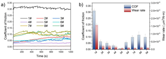 (a) Dynamic friction coefficient curves and (b) tribological properties of PEI/PTFE-WSe2 composites materials.