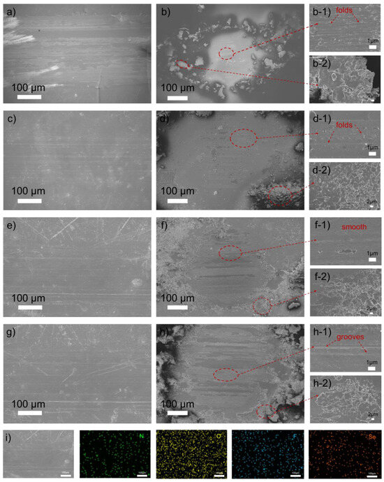 The surface morphology of the composite material was examined after friction testing using scanning electron microscopy, focusing on four distinct samples to evaluate various wear mechanisms (samples 1#, 2#, 5#, and 9#). Figure 9a–h illustrate the morphology of the worn surfaces of the composite material and the corresponding steel balls. As shown in Figure 9a, significant wear scars are evident on the sliding surface of pure PEI. Large aggregates of debris and numerous wrinkles were observed on the surface of the steel ball (Figure 9b). This phenomenon is attributed to the adhesive forces between PEI and the steel ball, which induce surface deformation. Under reciprocating motion, debris is continuously generated and accumulates, progressively eroding the surface. At this stage, the predominant wear mode for PEI is adhesive wear. The addition of 10% PTFE improved the surface wear of the composite material (Figure 9c), however, it still exhibited typical polymer wear characteristics, with wrinkles remaining on the surface of the steel ball (Figure 9d–1), indicating ongoing adhesive wear. The incorporation of nanofillers led to smoother worn surfaces and lighter wear marks, accompanied by minimal debris (Figure 9e,g), indicating the presence of abrasive wear. Comparative analysis of the wear patterns on the steel balls reveals that the more uniform dispersion of 5 wt% TA-WSe2 within the PEI/PTFE matrix results in a smoother wear surface, with no observable wrinkles or grooves. The EDX elemental mapping image of the wear surface (Figure 9i) further confirms the uniform distribution of N, O, F, and Se on the surface, substantiating the formation of a transfer film containing these elements, which significantly enhances the friction performance of the composite material. Conversely, grooves were observed on the steel ball with 2 wt% WSe2. This can be attributed to the inadequate ball milling of WSe2, which prevents its uniform distribution within the PEI/PTFE matrix and leads to poor dispersibility, resulting in restacking within the composite material. Additionally, the interfacial adhesion between WSe2 and the PEI/PTFE matrix is weak, hindering effective load transfer and resulting in stress concentration.