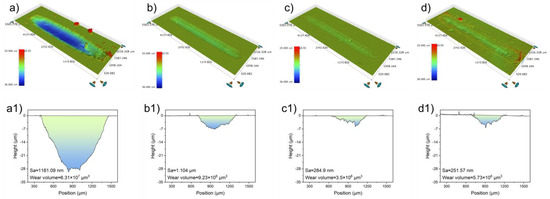 (a) 3D morphologies of the worn surface and the corresponding 2D height profile curves of (a,a1) pure PEI, (b,b1) PEI/PTFE, (c,c1) PEI/PTFE/5 wt% TA-WSe2, and (d,d1) PEI/PTFE/WSe2.