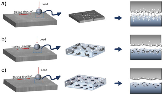 Schematic diagram of lubrication mechanism of PEI composite materials of (a) PEI/PTFE, (b) PEI/PTFE/2 wt% WSe2, and (c) PEI/PTFE/5 wt% TA-WSe2.