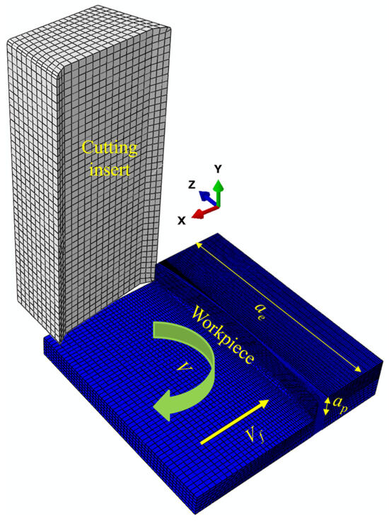 Based on the actual insert specifications and cutting conditions, a 3D FE simulation model for high-speed cutting of Al 7050 was established by ABAQUS 2020 software, as shown in Figure 2. The tool is in rotational motion relative to the workpiece and the tool is defined as a rigid body. For the meshing of the model, the thermo-mechanical coupling plane strain four-node quadrilateral element (CPE4RT) was employed to divide the grid, and the high-density grid was used in the tool–work contact area, and the sparse grid was used in other areas. The simulation employed explicit thermomechanical coupling analysis and described the formation of chips and material failure based on strain-based material fracture and separation criteria from a physical standards perspective. The contact between the tool and workpiece was modeled using a modified Coulomb cohesive sliding friction model.