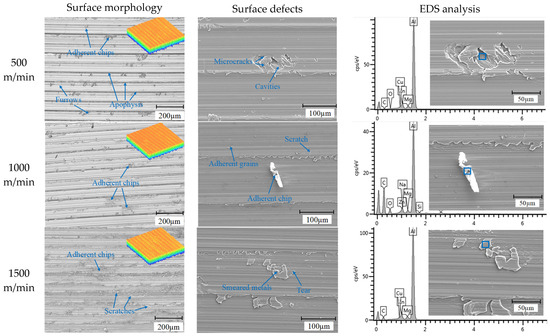 As the cutting speed is further increased to 1500 m/min, the apophysis becomes less pronounced and a large number of adherent chips and visible scratches become apparent. In addition, there are obvious smeared metals and tearing on the surface, broken small material with the tool on the machining surface movement and extrusion on the surface of the workpiece to produce tearing [44]. The analysis indicates that the high cutting speed generates more cutting heat, resulting in increased adherent chips, and the impact extrusion of the tool is also enhanced, resulting in the surface residue being ironed on the machining surface [7,43], and chips or shedding particles following the movement of the tool cause scratches [4,22].