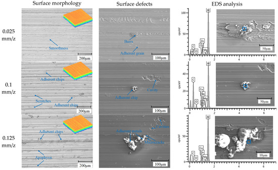The effect of feed rate on surface morphology and defects is illustrated in Figure 4. At fz = 0.025 mm/z, the surface is smooth, resulting in good overall surface quality. Burrs and small particles adhere to the machined surface, and the main elements in the chemical composition of the burr are the same as the matrix material, which is the result of plastic deformation caused by high-speed impact and compression of the tool on the surface [43,45].