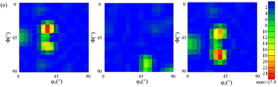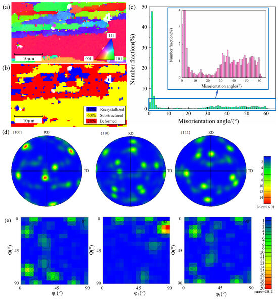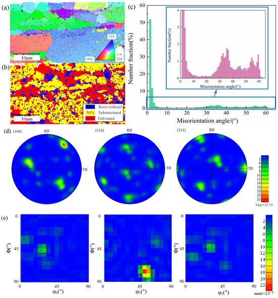 The microstructure of the machined subsurface at fz = 0.125 mm/z is illustrated in Figure 8. The crystal orientation shown in Figure 8a is significantly different from that shown in Figure 6a. As depicted in Figure 8b, the proportions of recrystallization grains, substructured grains and deformation grains on the machined subsurface are 19%, 56% and 25%, respectively. Compared with Figure 6b, the percentage of recrystallization grains, substructured grains and deformation grains increased by 7%, decreased by 4% and decreased by 3%, respectively. Due to the large amount of cutting heat generated by a large feed rate, high cutting temperature promotes recrystallization behavior. As shown in Figure 8c, the proportions of MA ≤ 2°, LAGBs and HAGBs are 54%, 8.6% and 37.4%, respectively. High temperatures can promote the migration and recrystallization of grain boundaries, thus forming HAGBs. The main crystallographic textures are the {110}<112> Brass texture, {123}<634> S texture, {124}<112> R texture, and {110}<100> Goss texture shown in Figure 8d,e. Compared with Figure 6d,e, there is a {110}<100>Goss texture present, and the texture intensity of {110}<112> Brass texture, {123}<634> S texture and {124}<112> R texture are enhanced. With the increase in feed rate, the material removal rate and friction effect are enhanced, resulting in increased cutting heat and higher temperature, and the dynamic recrystallization {124}<112> R-oriented recrystallized grains grow preferentially, which makes the {124}<112> R texture strength high. The change in feed rate leads to different shear deformation of the deformed layer, and the texture type and strength change [48].