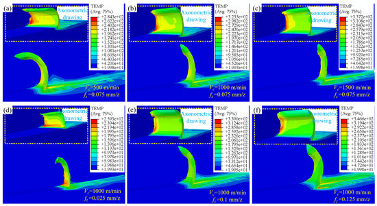 Temperature field cloud maps at different cutting parameters: (a) Vc = 500 m/min, fz = 0.075 mm/z, (b) Vc = 1000 m/min, fz = 0.075 mm/z, (c) Vc = 1500 m/min, fz = 0.075 mm/z, (d) Vc = 1000 m/min, fz = 0.025 mm/z, (e) Vc = 1000 m/min, fz = 0.1 mm/z, (f) Vc = 1000 m/min, fz = 0.125 mm/z.