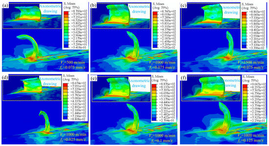 Equivalent stress field cloud maps at different cutting parameters: (a) Vc = 500 m/min, fz = 0.075 mm/z, (b) Vc = 1000 m/min, fz = 0.075 mm/z, (c) Vc = 1500 m/min, fz = 0.075 mm/z, (d) Vc = 1000 m/min, fz = 0.025 mm/z, (e) Vc = 1000 m/min, fz = 0.1 mm/z, (f) Vc = 1000 m/min, fz = 0.125 mm/z.