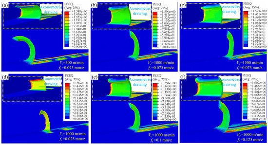 Equivalent strain field cloud maps at different cutting parameters: (a) Vc = 500 m/min, fz = 0.075 mm/z, (b) Vc = 1000 m/min, fz = 0.075 mm/z, (c) Vc = 1500 m/min, fz = 0.075 mm/z, (d) Vc = 1000 m/min, fz = 0.025 mm/z, (e) Vc = 1000 m/min, fz = 0.1 mm/z, (f) Vc = 1000 m/min, fz = 0.125 mm/z.