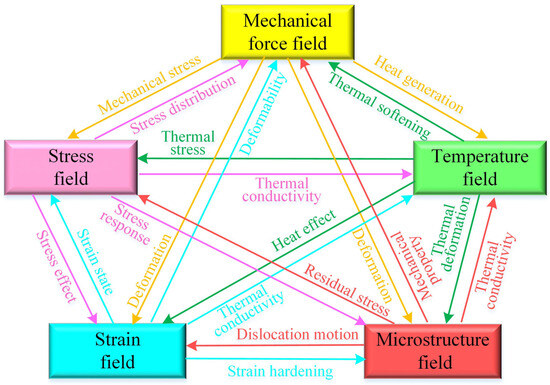 The aluminum alloy is a face-centered cubic structure; due to the high stacking fault energy, the processing deformation is mainly completed by dislocation slip [47]. Different grain orientations lead to the activation of different numbers and types of slip systems, which directly affect the plastic deformation degree of the ally, which causes different flow stresses and then produces different cutting forces and cutting heat. The workpiece’s surface quality and microstructure evolution are greatly affected by this. The multi-physical field mechanism is presented in Figure 13.
