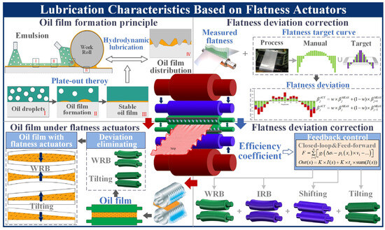 Work roll bending and tilting roll by adjusting the roll surface convexity and roll surface contact angle, respectively, making the change in the profile of the loaded roll gap and online dynamic correction of the flatness, but also affects the lubricant distribution characteristics in the loaded roll gap, and thus changes the lubrication characteristics [10]. The lubrication characteristic of cold strip rolling based on flatness actuators is shown in Figure 1.