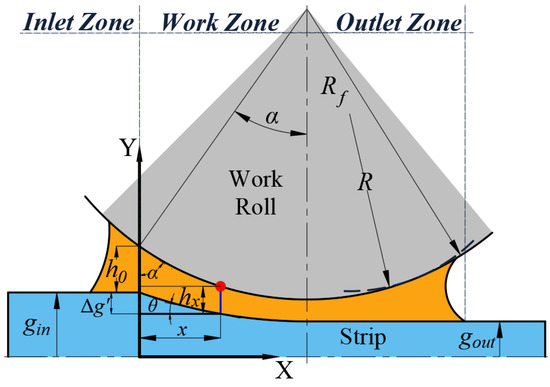 The oil film profile in the work zone coincides with the loaded roll gap characteristics based on the fluid characteristics with sufficient lubrication [26]. Figure 2 shows the distribution characteristics of lubricant in the loaded roll gap under ideal lubrication characteristics in cold strip rolling.